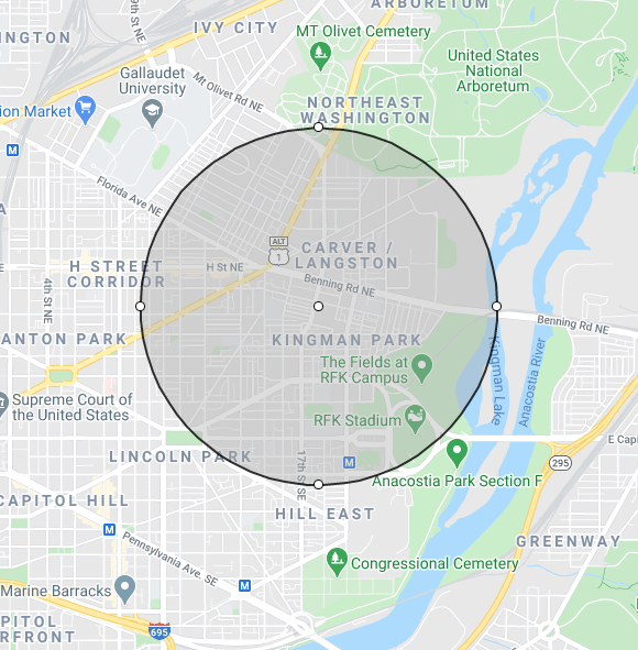 DCPL considers an area served by a library if there is a library within three-quarters of a mile. By that standard, about two-thirds of Trinidad (below) is served by the Rosedale Library, across Bladensburg Road and the starburst intersection in Kingman Park. Much of SMD 5D01, especially Ivy City, is not close to any library.